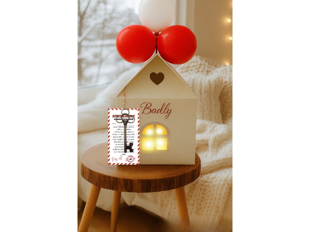 Ráno se pak objeví v krásném domečku se jménem vašeho elfa. Domeček je vybavený světýlkem a obsahuje i 4 nafukovací balónky,