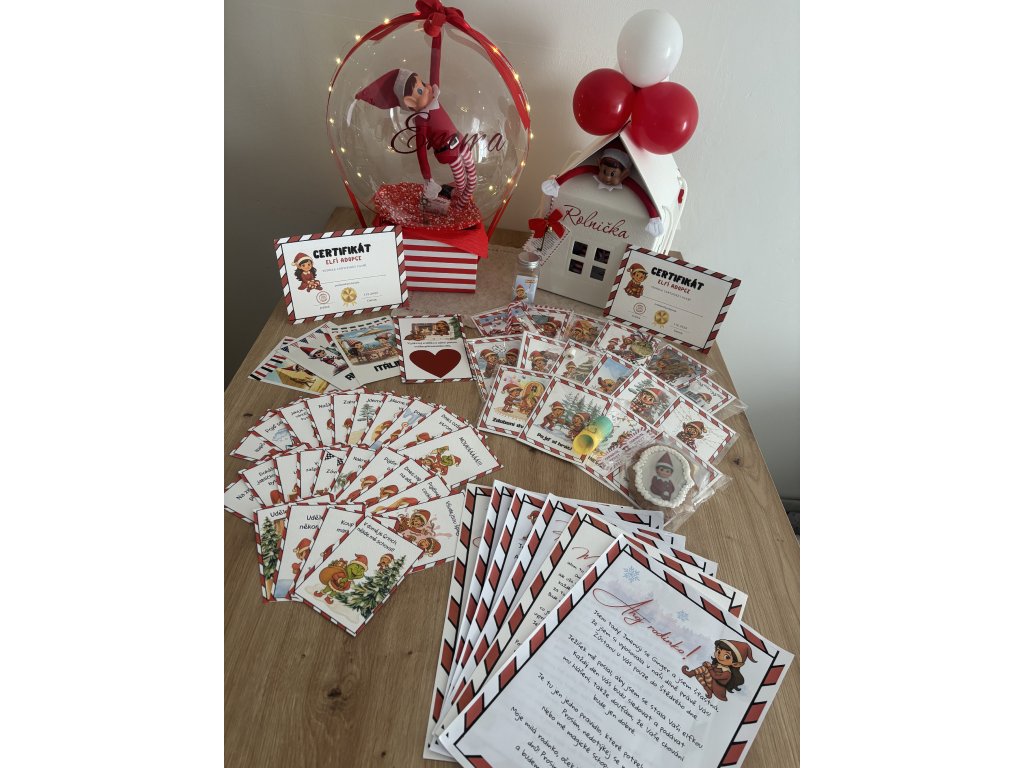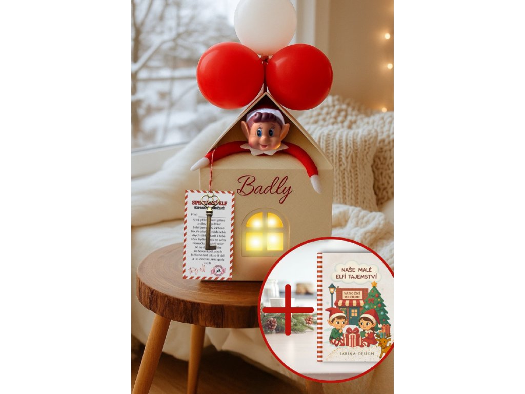 Ráno se pak objeví v krásném domečku se jménem vašeho elfa. Domeček je vybavený světýlkem a obsahuje i 4 nafukovací balónky,