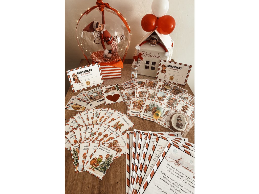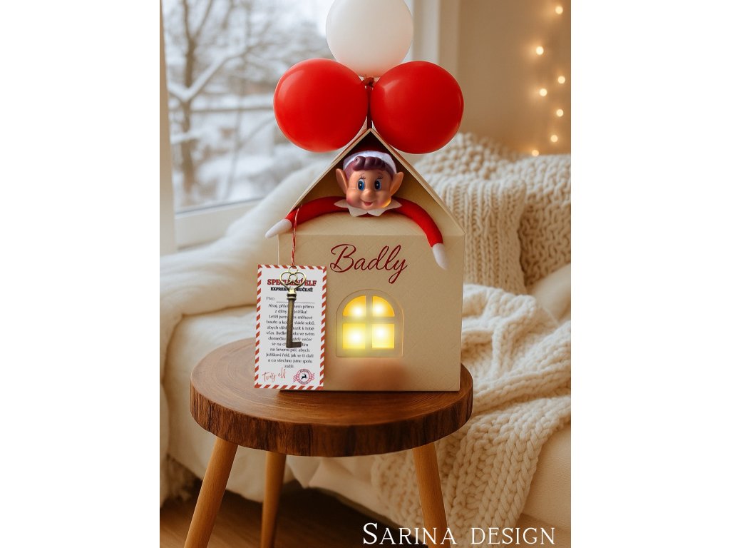 Ráno se pak objeví v krásném domečku se jménem vašeho elfa. Domeček je vybavený světýlkem a obsahuje i 4 nafukovací balónky,