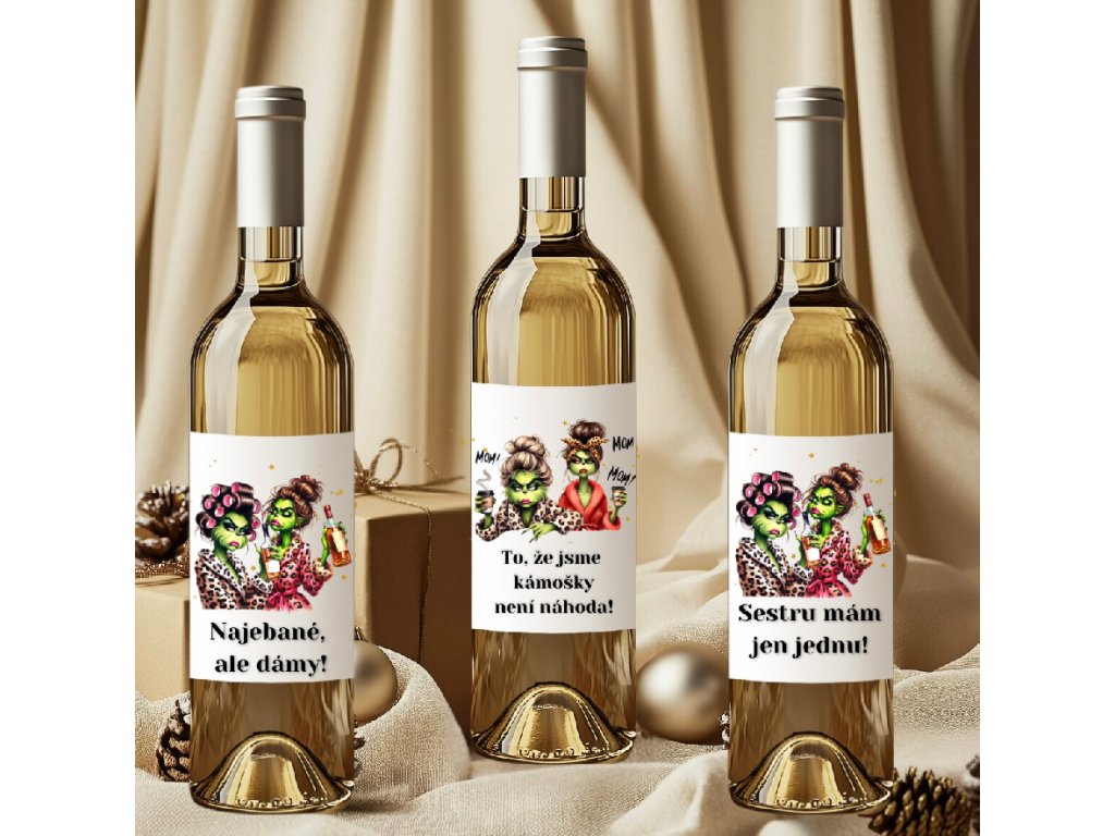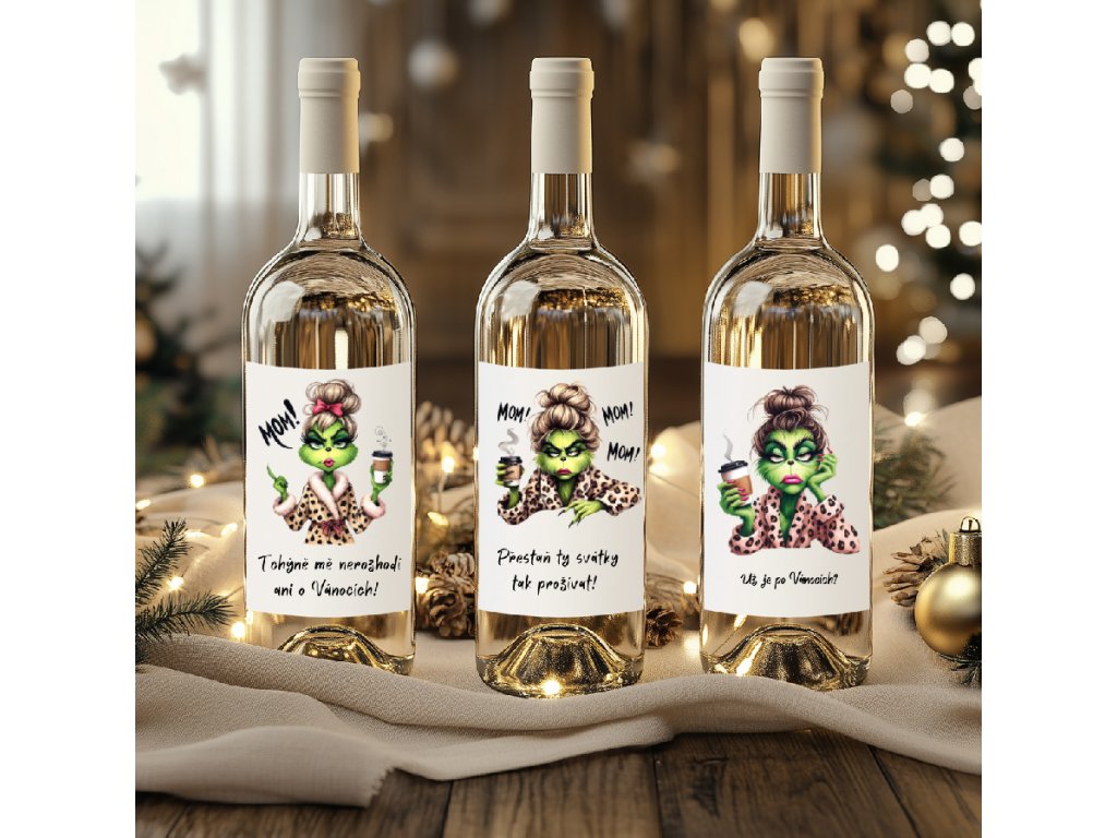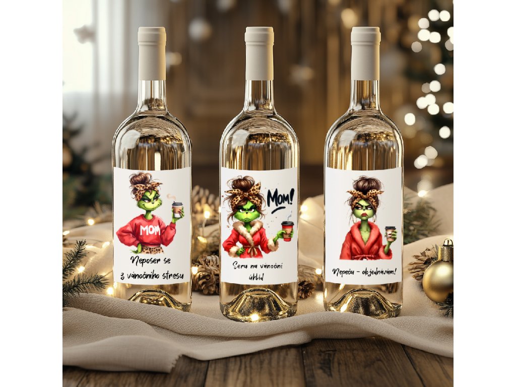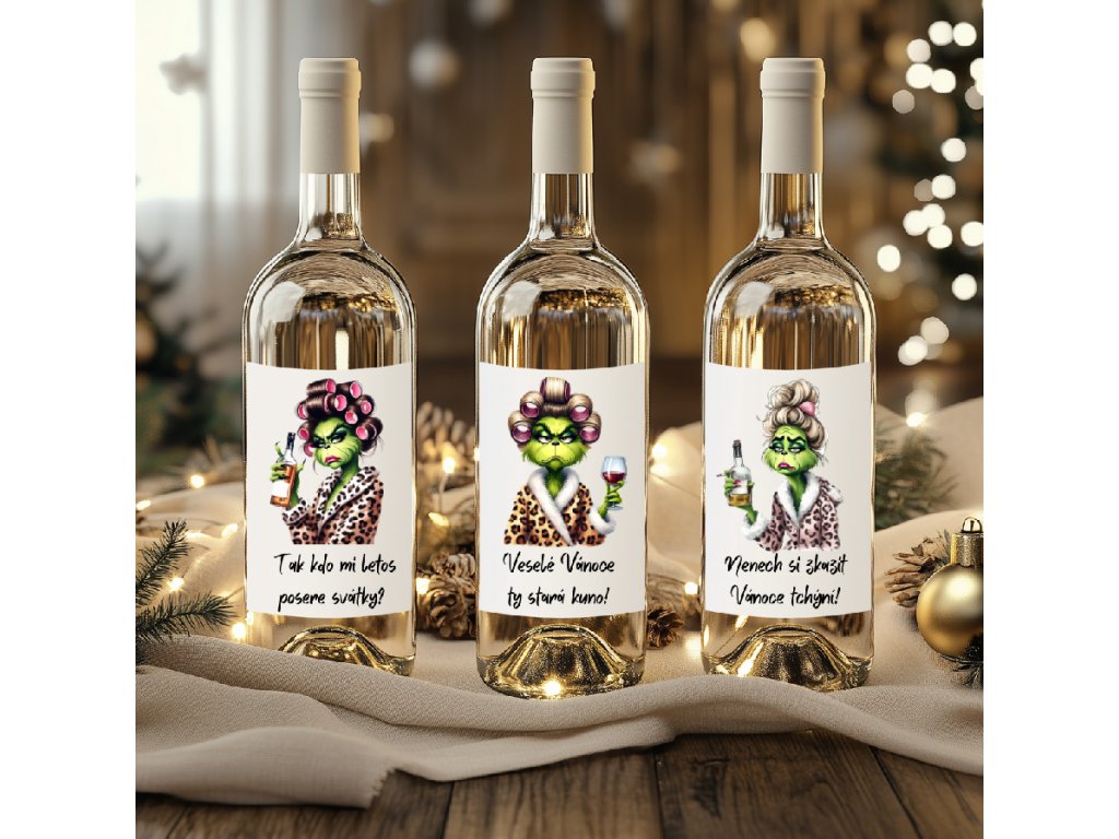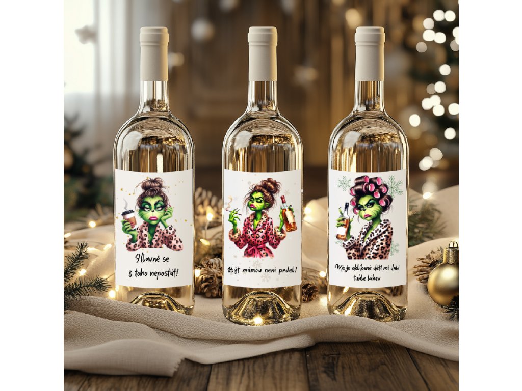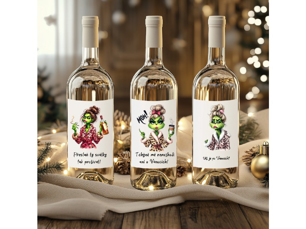 - Originální etikety s Grinchem, které nenechají nikoho chladným